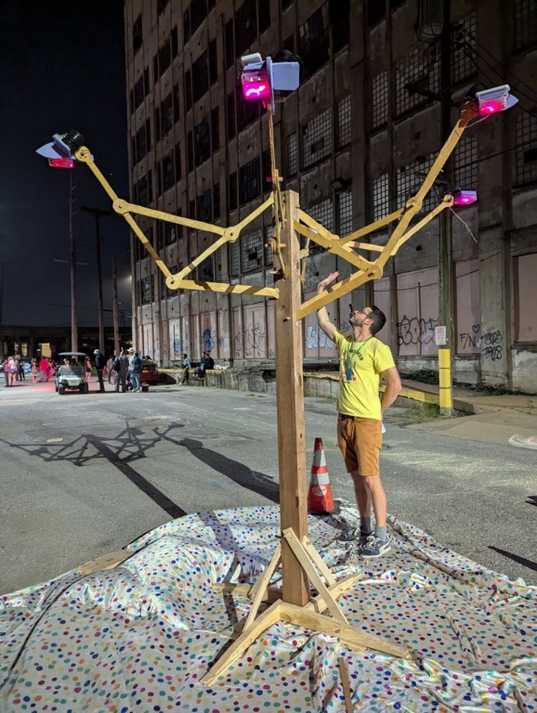 - "Sounds of the Nine Realms" (photo) (video) - A tree canopy made from mechanical linkages with an ensemble of synthesizers mounted to the branches. Each synth reacts to participants presence and allows them to to change the generative soundscape.